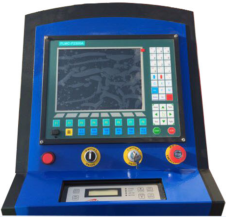 該機型控制系統采用上海交大F2300系列;該型火焰/等離子切割機兩用數控系統是一款專為龍門式切割機設計制造的標準型控制系統。擁有完善的切割加工工藝,10.4英寸真彩液晶顯示,一體式鍵盤面板,秉承“交大”的設計傳統,20年切割行業應用實踐,擁有廣泛的用戶認知度。系統與IBE,FASTCAM等CAD/CAM套料軟件完全兼容;采用U盤讀取程序和軟件升級;該控制系統多達45種常用圖形庫、圖形矩陣、交錯、重復排列、根據鋼板厚度,在轉角處可自動限速,有效防止過燒、圖形鋼板校正、支持邊緣切割、偏移切割、具有斷電、斷點保護記憶功能、支持文泰、TYPEIII|、PM2000等特殊套料軟件。