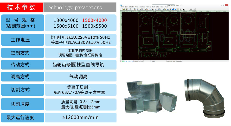 特別針對通風管道行業專門用于切割2mm以下的薄、中碳鋼板、 不銹鋼板、鋁板、銅板、鍍鋅板、白鐵皮、合金板等多種板材材料,快速風管等離子切割機,效果佳、無掛渣和毛刺;在使用時直接連接普通配置的臺式電腦,運用文泰軟件或AutoCAD繪圖軟件直接用于繪制圖形,不需轉換,直接切割,并可進行簡單的排料,工件共邊設置,購買本公司此款設備可享受免費送貨上門、安裝調試及培訓、包教包會!